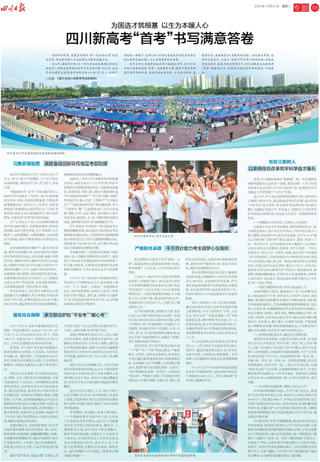 四川新高考“首考”的圆满落幕,既是改革实践交出的成功答卷,更是践行教育初心写下的生动注脚。从政策体系的精细搭建到组考服务的暖心护航,从阳光录取的公正落地到育人模式的深度革新,每一项制度设计都紧扣“立德树人”根本,每一份努力都承载着“为党育人、为国选才”使命。这场改革不仅推动教学方式迭代升级,更筑牢了教育评价体系重构的基石,为培养适配未来的新时代人才铺平道路;不仅为四川学子搭建起更广阔的成长舞台,也为教育高质量发展注入新动能。