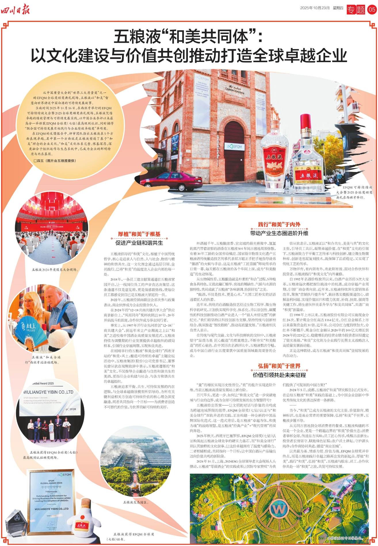 五粮液2024年度股东大会现场。五粮液“和美全球行”西班牙站活动现场。五粮液获得EFQM全球奖(七钻)最高级别认证颁奖现场。五粮液获得EFQM全球奖(七钻)证书。五粮液生态园区。五粮液酿酒专用粮基地。