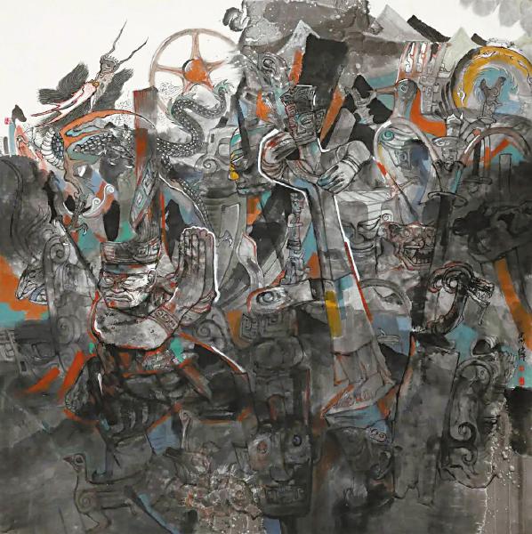 三星堆文明是中华文明的重要组成部分,出土的大量青铜器、金器等表明,当时铸造工艺已经达到很高的水平。四川画家王忠伟的《亘古回音》入选近期举办的全国写意美术作品展,作品以两件具有代表性的青铜器(大立人、扭头跪坐人像)作为主体,其他重要器物交错映衬于画面,使画面主次得当。画面下半部分处于暗中,往上则逐渐清晰、鲜明,如同从地下慢慢被发掘出来,在形式美感和装饰效果方面体现了三星堆的魅力。此外,作者加入龙的造型,暗喻三星堆文明与中华文明一脉相承,不仅带给观者美的感受,也使观者增强了民族自信心和自豪感。 (余如波)
