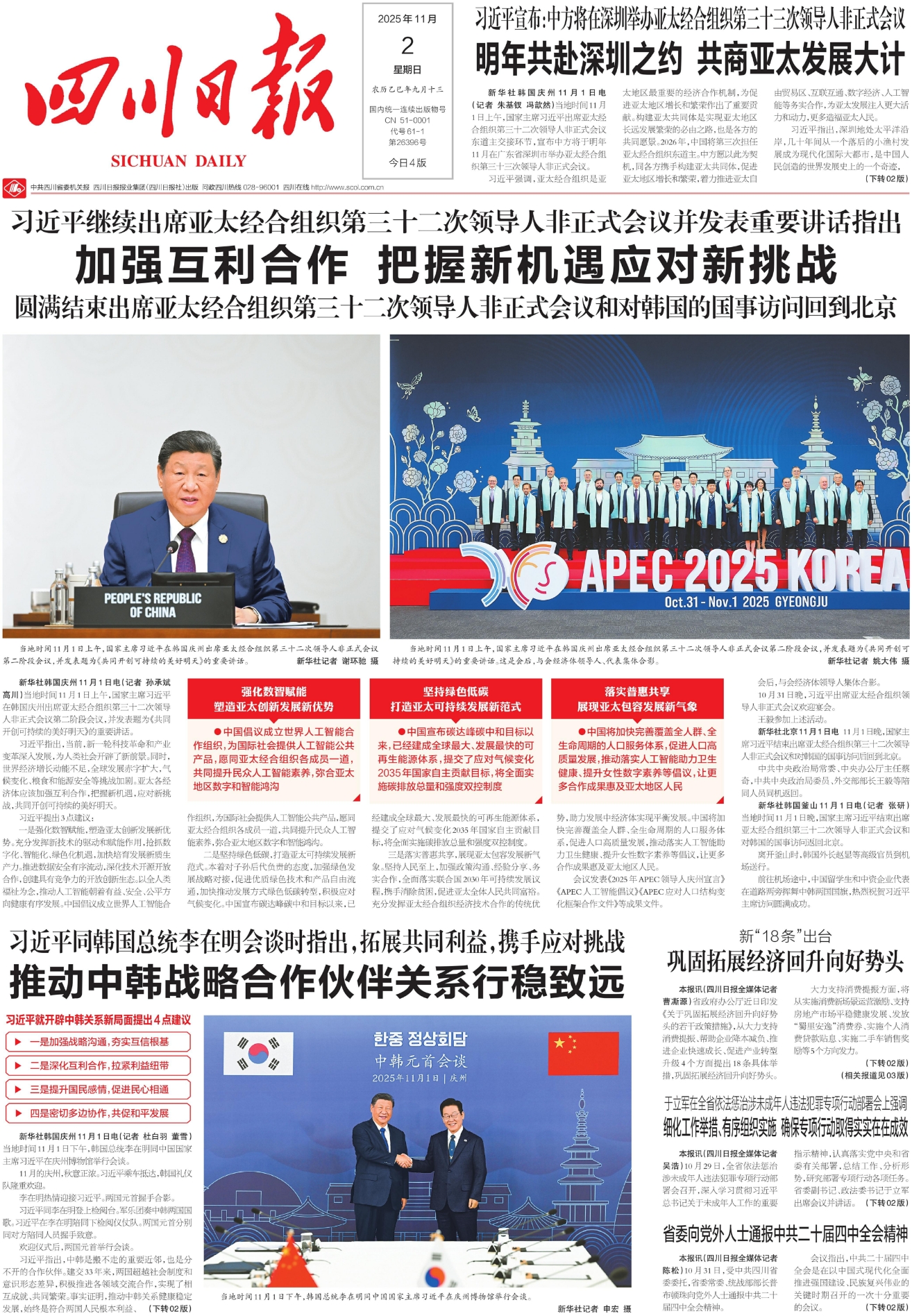四是密切多边协作,共促和平发展。中方祝贺韩方成功举办亚太经合组织领导人非正式会议,愿以接任亚太经合组织东道主为契机,同各方一道推进亚太自贸区进程和区域经济一体化,共建亚太共同体。中韩双方要共同践行真正的多边主义,维护多边贸易体制,推动国际治理朝着更加公正合理的方向发展。