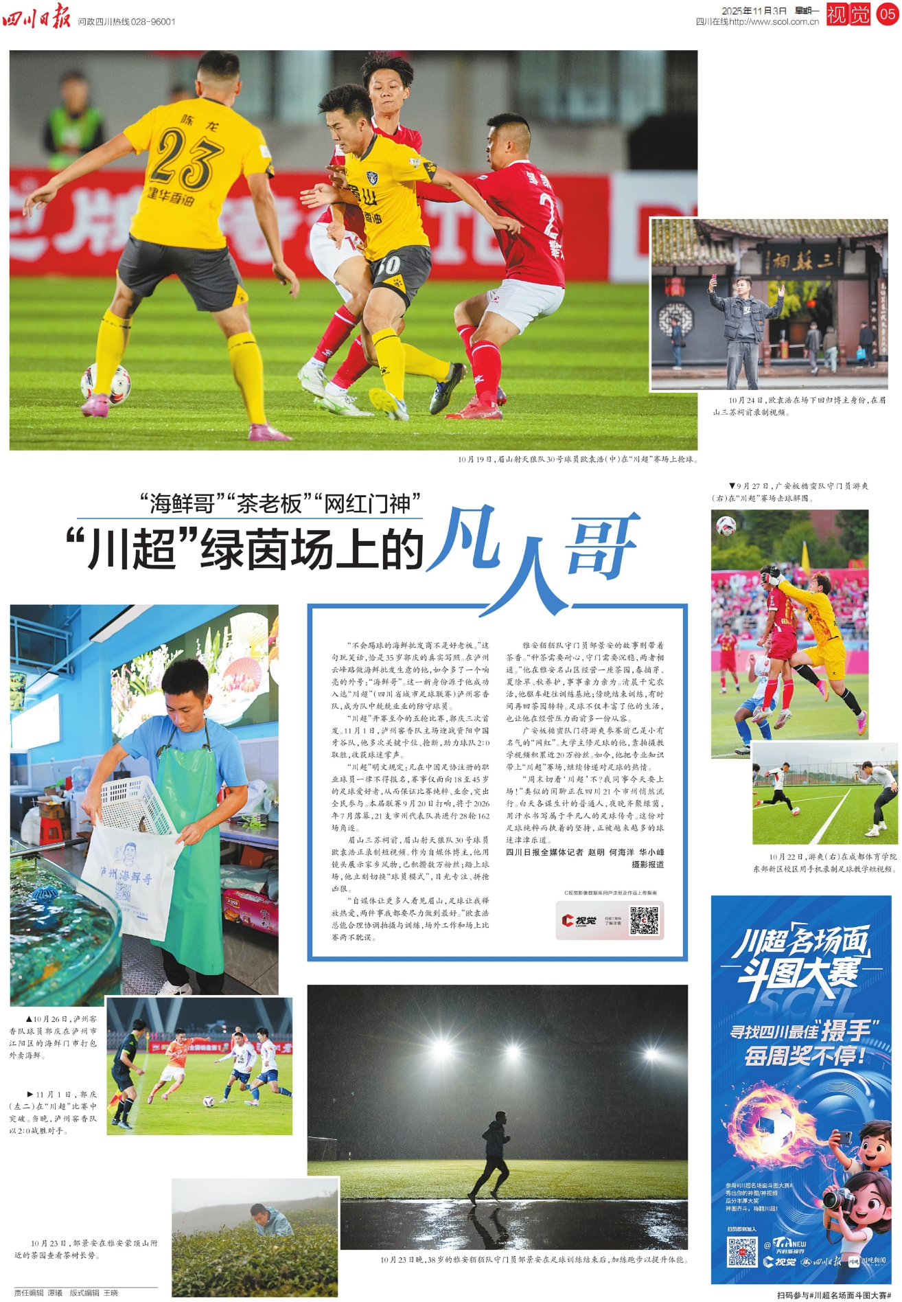 10月19日,眉山射天狼队30号球员欧袁浩(中)在“川超”赛场上抢球。10月26日,泸州窖香队球员郭庆在泸州市江阳区的海鲜门市打包外卖海鲜。11月1日,郭庆(左二)在“川超”比赛中突破。当晚,泸州窖香队以2∶0战胜对手。10月23日晚,38岁的雅安貊貊队守门员邹景安在足球训练结束后,加练跑步以提升体能。10月23日,邹景安在雅安蒙顶山附近的茶园查看茶树长势。10月24日,欧袁浩在场下回归博主身份,在眉山三苏祠前录制视频。9月27日,广安板楯蛮队守门员游爽(右)在“川超”赛场击球解围。10月22日,游爽(右)在成都体育学院东部新区校区用手机录制足球教学短视频。扫码参与#川超名场面斗图大赛#