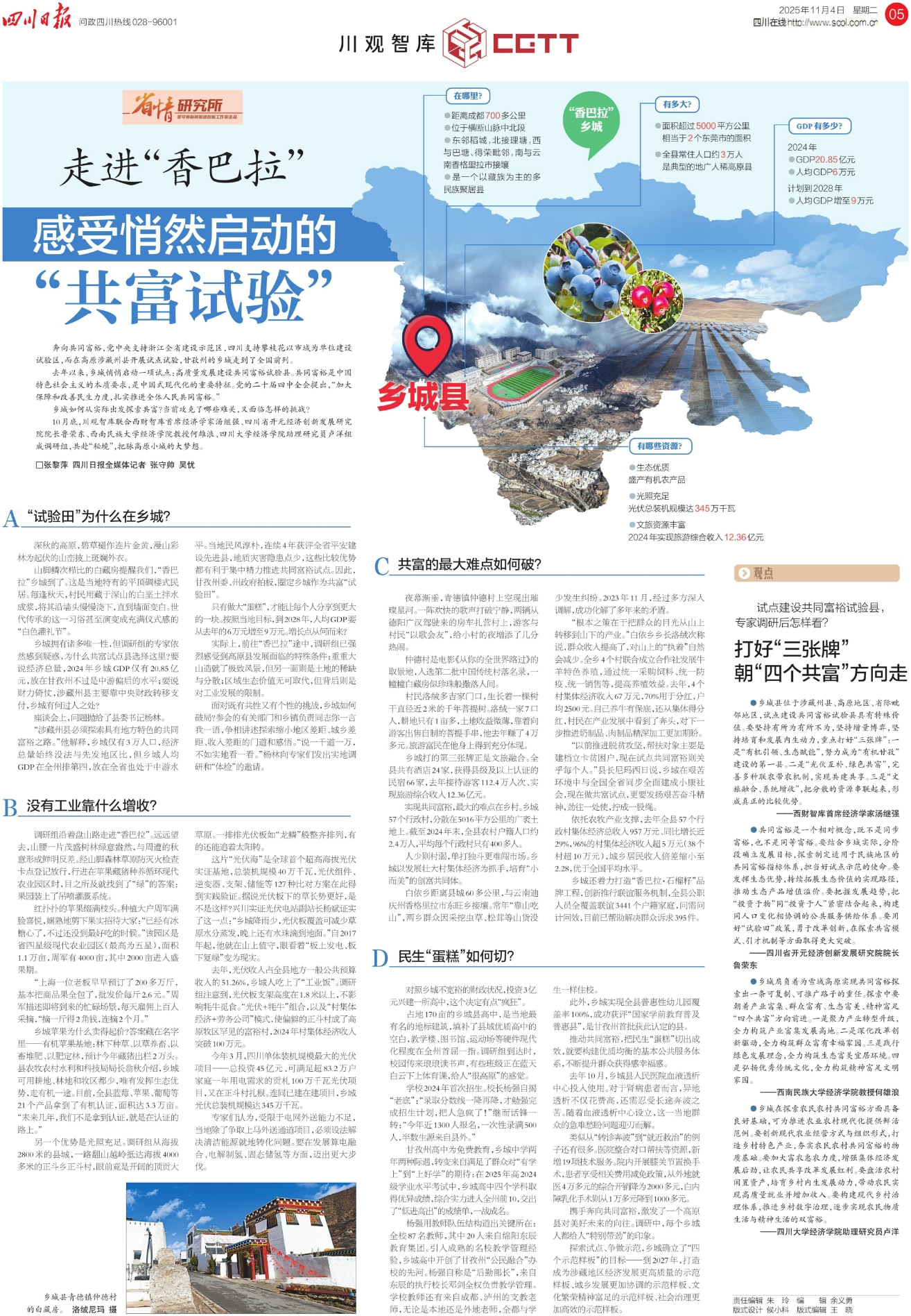 奔向共同富裕,党中央支持浙江全省建设示范区,四川支持攀枝花以市域为单位建设试验区,而在高原涉藏州县开展试点试验,甘孜州的乡城走到了全国前列。
