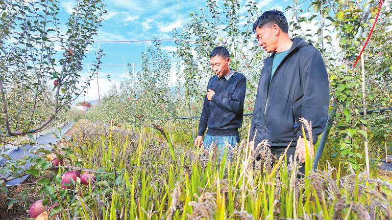 今年4月,在技术专家指导下,朱光伟在自家矮化苹果树下试种了1亩旱稻。“以前只在树下种过大豆,种旱稻是头一回。”他坦言。