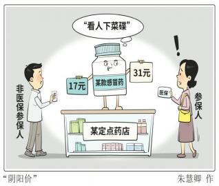 近期,部分地区陆续发现定点药店对医保和非医保患者采用“阴阳价”行为,同一家药店同一款感冒药价格相差近一倍。