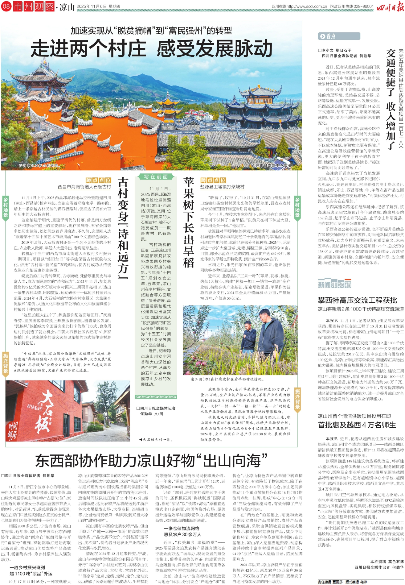 古村新貌的巨变,正是凉山州巩固拓展脱贫攻坚成果同乡村振兴有效衔接的缩影。今年是“十四五”规划收官之年,五年来,凉山州在乡村振兴、文旅融合等方面取得了显著进展,高质量发展和现代化建设迈出坚实步伐,加速实现从“脱贫摘帽”到“富民强州”的转型,为“十五五”时期经济社会发展奠定了坚实基础。