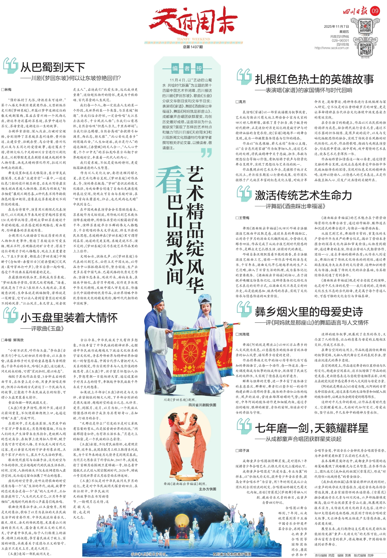 11月4日,以“艺动巴山蜀水 共绘时代新篇”为主题的第十四届中国艺术节闭幕,四川报送的川剧《梦回东坡》、歌曲《玉盘》分获文华剧目奖和文华节目奖;表演唱《家谱》、舞蹈《酒曲踩出幸福谣》、舞蹈《阿妈就是那座山》、成都童声合唱团获群星奖,均创历史最好成绩。这些项目为什么能获奖?展现了怎样的艺术特点和魅力?四川日报《天府周末》和川观新闻文化频道特约专家学者撰写相关评论文章,以飨读者,敬请垂注。