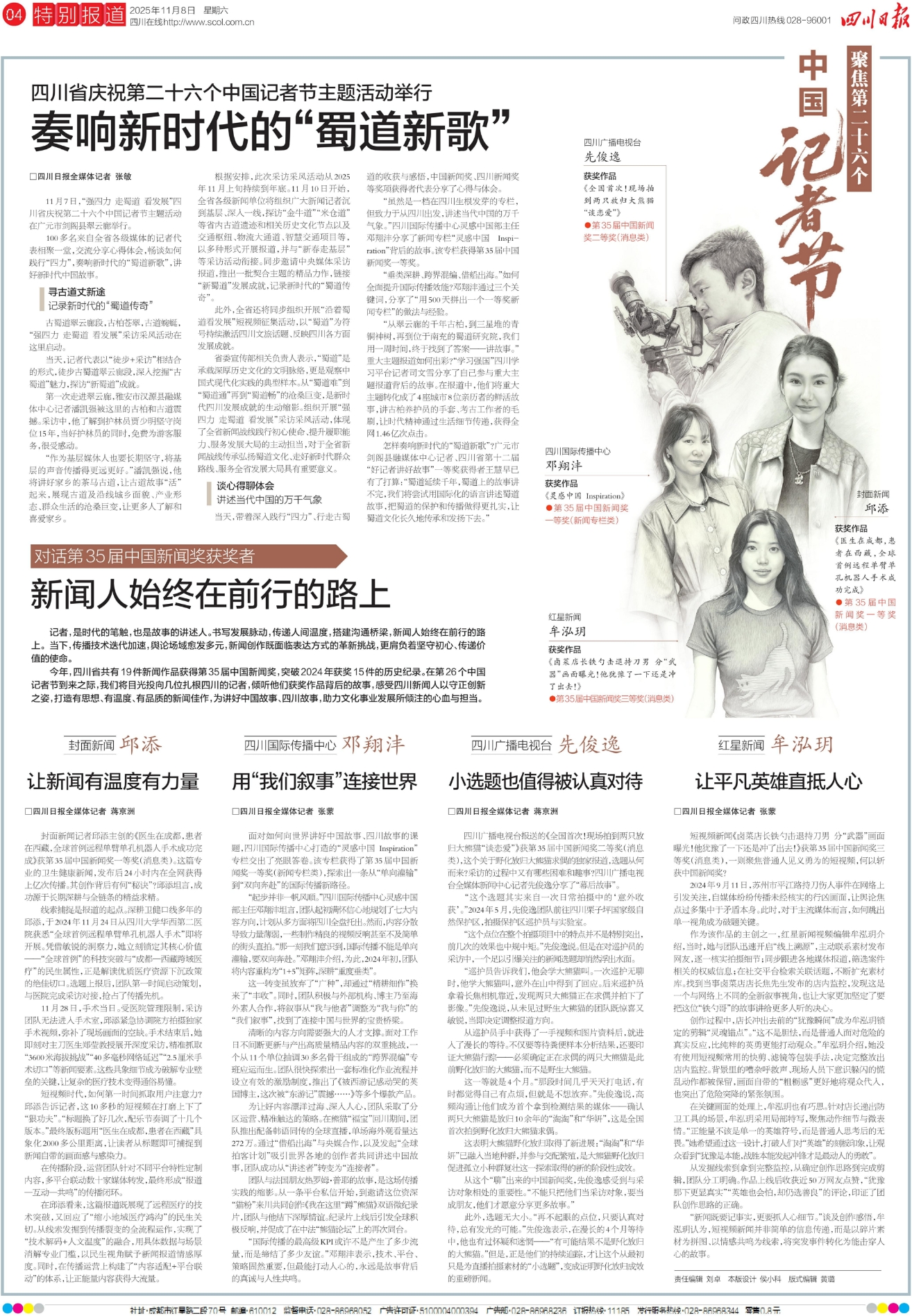 今年,四川省共有19件新闻作品获得第35届中国新闻奖,突破2024年获奖15件的历史纪录。在第26个中国记者节到来之际,我们将目光投向几位扎根四川的记者,倾听他们获奖作品背后的故事,感受四川新闻人以守正创新之姿,打造有思想、有温度、有品质的新闻佳作,为讲好中国故事、四川故事,助力文化事业发展所倾注的心血与担当。