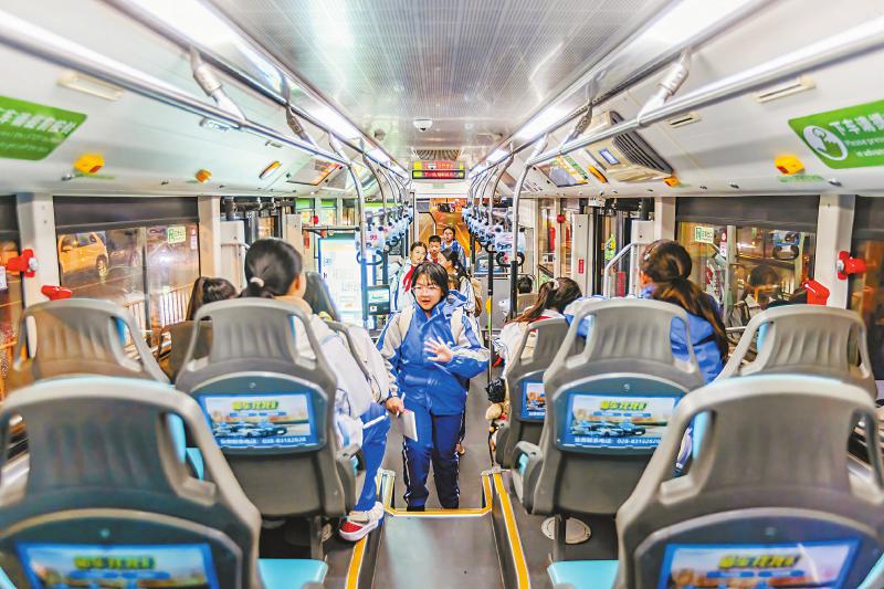 11月7日,成都定制公交D716线开通已满两月。该线路从金沙遗址路蜀风路口至青羊实验中学,精准对接家校点位、避开拥堵路段,大幅缩短学生上学放学时间,为学生铺就便捷上学之路。图为一名刚上车的学生和同学打招呼。 林漫 摄(C视觉)