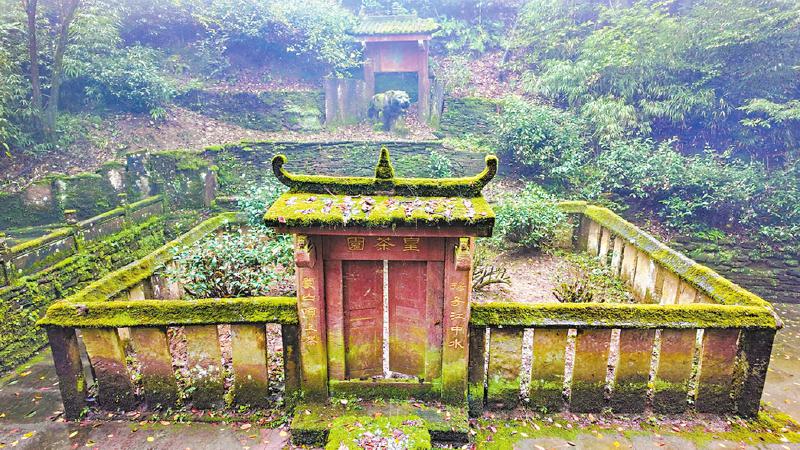 穿过牌坊,继续前行百余米,即进入皇茶园。其四周青苔覆石,双扇石门静立,门侧镌刻着千古名联:“扬子江中水,蒙山顶上茶”。相传,西汉时期,甘露道人吴理真在此驯化野生茶树,开人工种茶先河,被尊为“植茶始祖”。蒙顶山也因此被公认为“世界茶源”之一。自初唐起,当地茶叶便作为贡茶持续进贡皇室,成为中国古代茶叶品质与贡茶制度的巅峰象征。