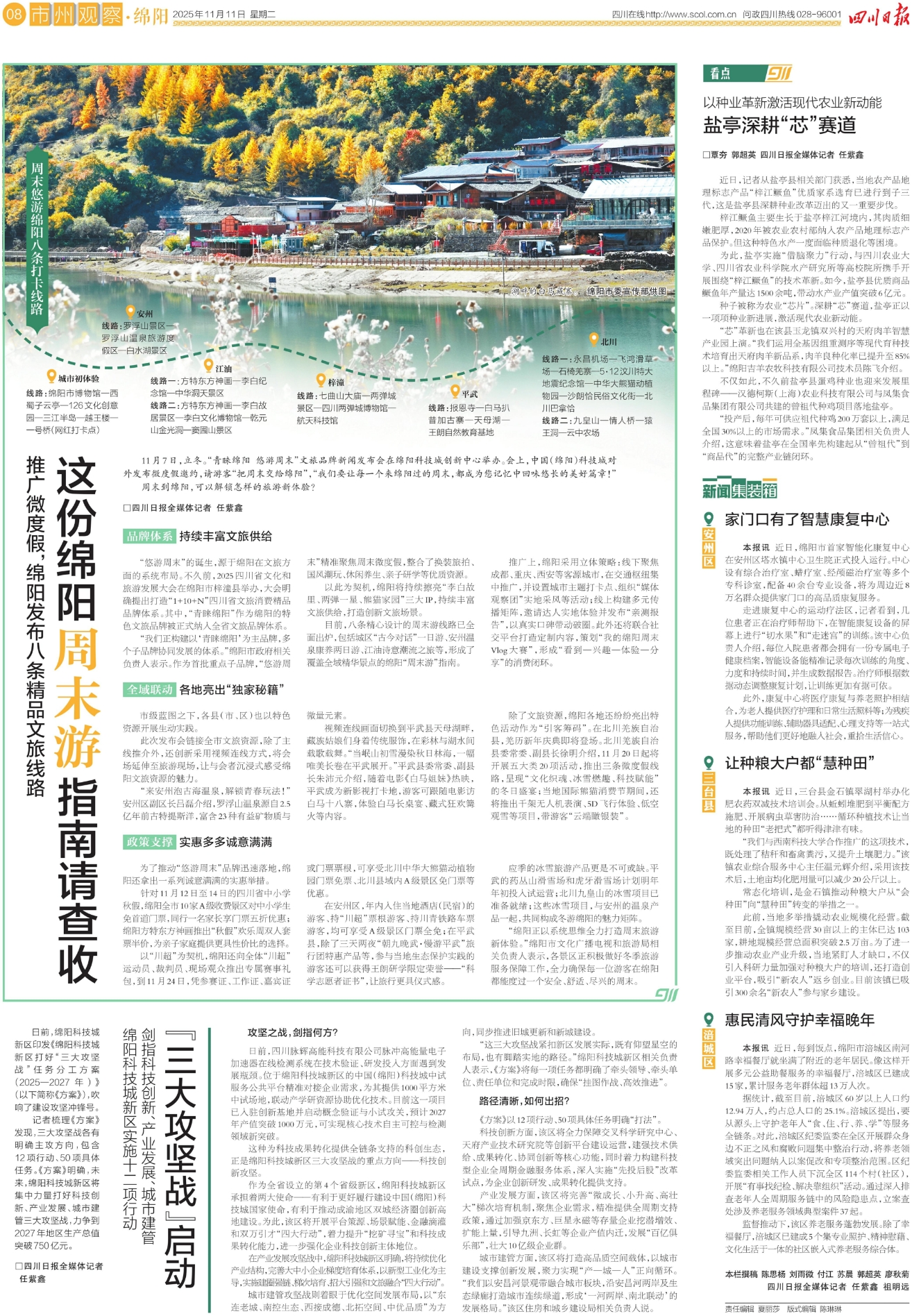 11月7日,立冬。“青睐绵阳 悠游周末”文旅品牌新闻发布会在绵阳科技城创新中心举办。会上,中国(绵阳)科技城对外发布微度假邀约,请游客“把周末交给绵阳”,“我们要让每一个来绵阳过的周末,都成为您记忆中回味悠长的美好篇章!”