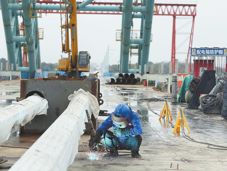 相比其他大桥,沱江特大桥主梁合龙采用张拉方式——在两侧桥梁板一点点向中心铺设到约20厘米距离时,最后一片钢梁不再吊装铺设,而是把两边的桥梁体向中间拉近,先拉紧再锁死,最后由工人手动焊接。“最后一次张拉中,12台600吨连续千斤顶,用力约5400吨,作业过程历时近3小时。”中铁大桥局成渝中线项目总工马天亮说。