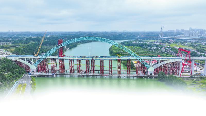 “这样的合龙方式,是配合大桥独特的设计。”中铁二院工程师彭福兵介绍,传统拱桥的桥拱受温度影响容易产生形变,从而带动桥面上下波动;梁桥虽然稳定,但需要在河中间建设桥塔,会对沱江生态和通航产生较大影响。为此,沱江特大桥有了创新设计,将拱桥的一只脚建在可活动的支座上,通过像弓弦一样的主梁将拱脚产生的巨大水平推力相互抵消,不对桥墩或地基产生水平推力。如此一来,就能形成“无推力”自平衡稳定结构,即便大桥桥拱轻微晃动,桥面也能保持平稳,让时速400公里的高铁稳稳通行。