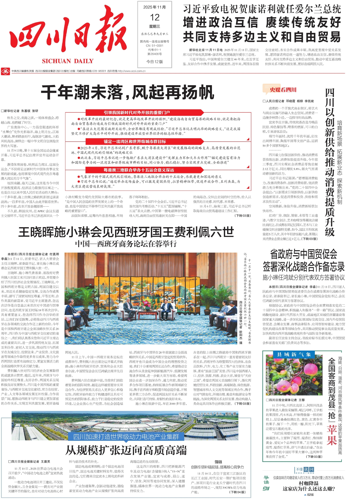 不止产能高。四川时代在宜宾建成全球首家电池“零碳工厂”,新投产的时代长安一期扩能项目有着当前全球最快、最先进的锂离子电池生产线……龙头企业不断进阶,持续提升着产品的核心竞争力。今年前三季度,宜宾动力电池产量同比增长46%、产值同比增长14%,四川动力电池产量占全国1/5。
