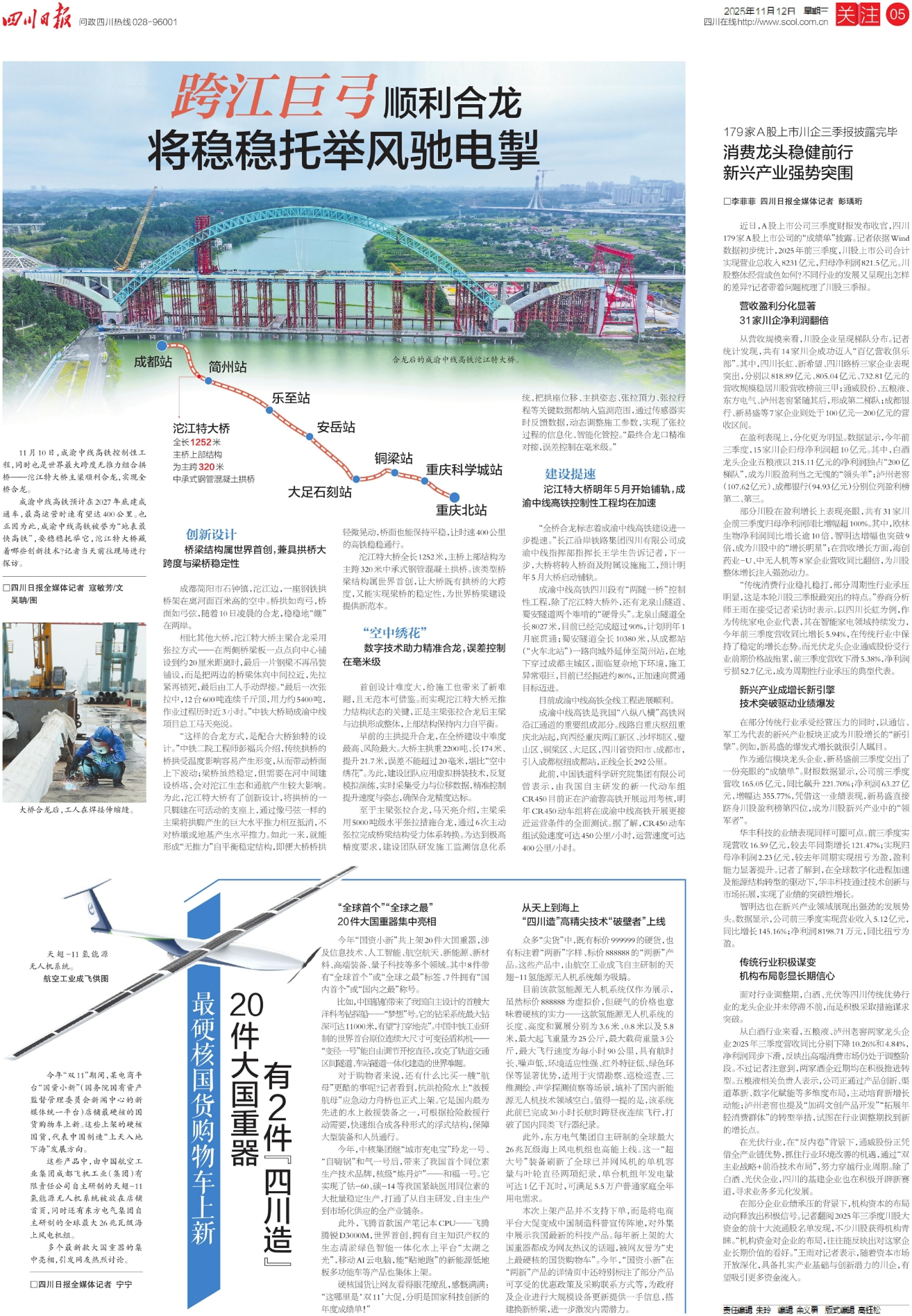 沱江特大桥全长1252米,主桥上部结构为主跨320米中承式钢管混凝土拱桥。该类型桥梁结构属世界首创,让大桥既有拱桥的大跨度,又能实现梁桥的稳定性,为世界桥梁建设提供新范本。
