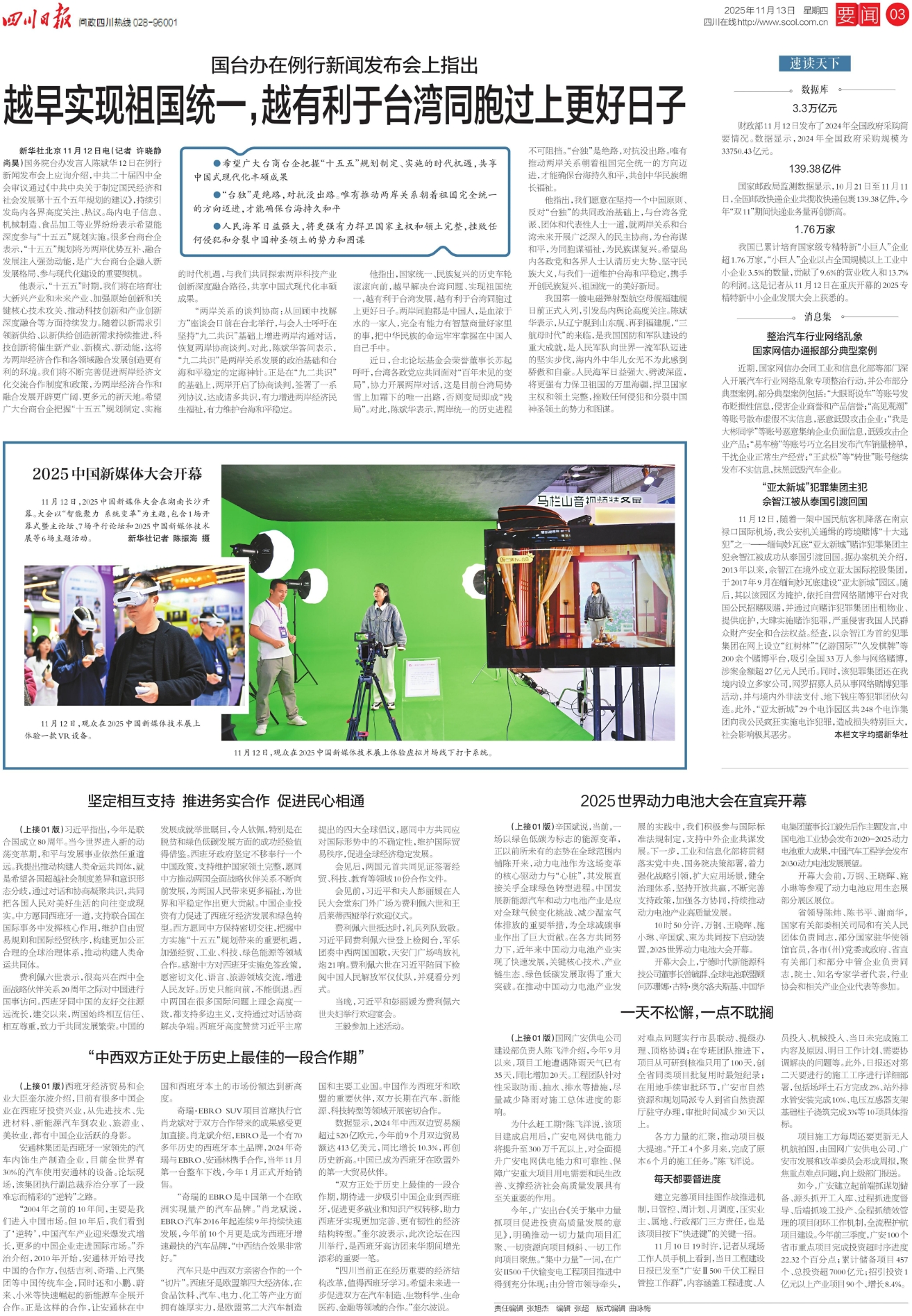 王晓晖代表省委、省政府,向给予四川动力电池产业发展大力支持的国家有关部委,以及各位专家学者、行业翘楚、参展客商表示感谢。他说,发展动力电池是全球能源转型的重要路径。党的十八大以来,习近平总书记深刻把握时代脉搏,鲜明提出“四大全球倡议”,前瞻谋划布局、系统推动实施,特别是把动力电池作为新能源产业的“绿色引擎”强力推进。经过持续努力,我国动力电池产量连续8年全球领先,建成产业链最全、规模最大的动力电池产业体系,已成为全球行业发展的主导者、引领者。党的二十届四中全会对“十五五”发展作出顶层设计和战略谋划,明确提出加快经济社会发展全面绿色转型,发展新能源等战略性新兴产业。我们坚信,作为新型能源体系的重要组成部分,动力电池产业空间巨大、未来前景广阔。四川是动力电池大省,我们愿与大家携手抢占技术变革风口,瞄准全固态电池等新一代技术加强联合攻关,围绕基础材料等共性技术搭建创新联合体,引领行业技术变革浪潮。我们愿与大家携手深耕广阔市场蓝海,积极拓展新型储能、低空经济、具身智能等新兴市场,构建全生命周期的产品谱系,更好激活消费潜能。我们愿与大家携手提升资源开发利用效率,整合全产业矩阵,探索以绿色能源制造绿色产品的“以绿制绿”新模式,形成低碳、高效、优质的竞争新优势。让我们共同努力,为加快经济社会发展全面绿色转型贡献智慧和力量。