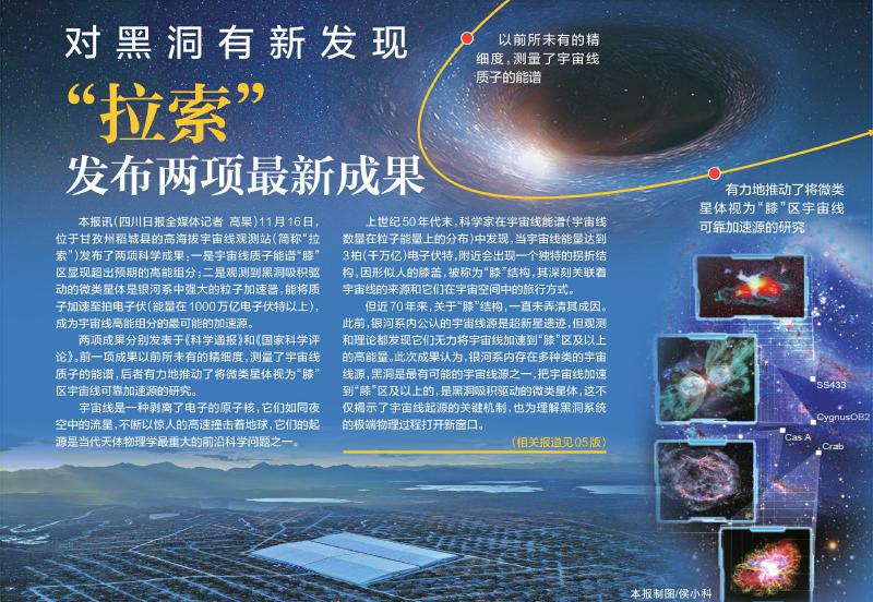 本报讯(四川日报全媒体记者 高杲)11月16日,位于甘孜州稻城县的高海拔宇宙线观测站(简称“拉索”)发布了两项科学成果:一是宇宙线质子能谱“膝”区显现超出预期的高能组分;二是观测到黑洞吸积驱动的微类星体是银河系中强大的粒子加速器,能将质子加速至拍电子伏(能量在1000万亿电子伏特以上),成为宇宙线高能组分的最可能的加速源。