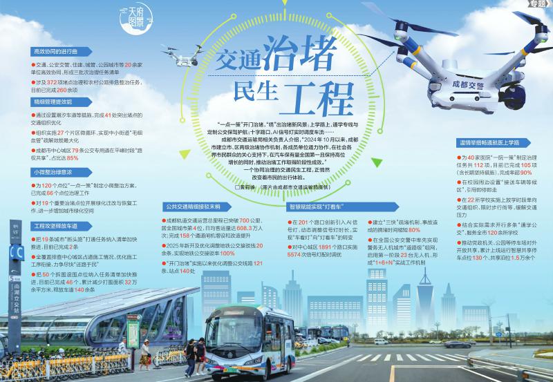 “一点一策”开门治堵,“绣”出治堵新风景:上学路上,通学专线与定制公交保驾护航;十字路口,AI信号灯实时调度车流……