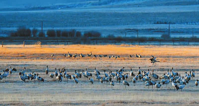 阿坝州红原县强化生态保护,筑牢长江黄河上游生态屏障,荒漠猫、白尾海雕、黑颈鹤等重点保护野生动物频繁现身。图为11月15日,阿坝州红原县月亮湾湿地,国家一级保护动物黑颈鹤在休憩觅食。 四川日报全媒体记者 何海洋 摄
