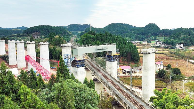 • 11月18日,在遂宁市安居区横山镇,成达万高铁德公村特大桥建设现场,一榀重达170吨的钢盖梁精准落位到桥墩钢柱脚上,标志着成达万高铁关键节点——上跨遂新联络线上行铁路钢盖梁吊装作业顺利完成。 张勤宝 摄(C视觉)