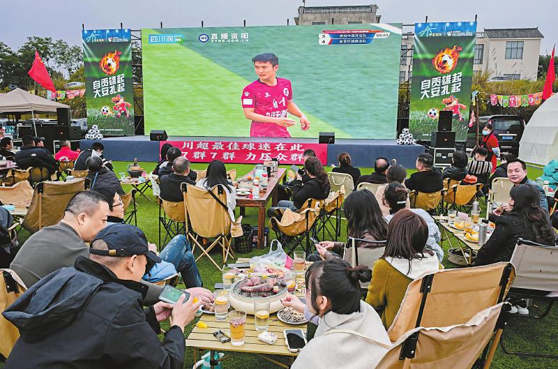 ▲11月16日,自贡市大安区青龙湖房车营地设置“川超”第二观赛点,市民与球迷围炉煮茶,通过大屏共同观赛。