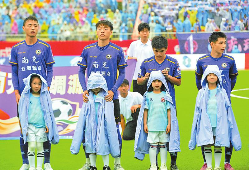 温馨时刻 10月19日,南充丝绸源点队主场迎战成都锦城队。赛前突降小雨,南充队球员主动脱下外套为小球童遮雨,场面温馨。