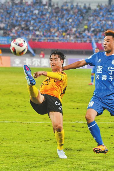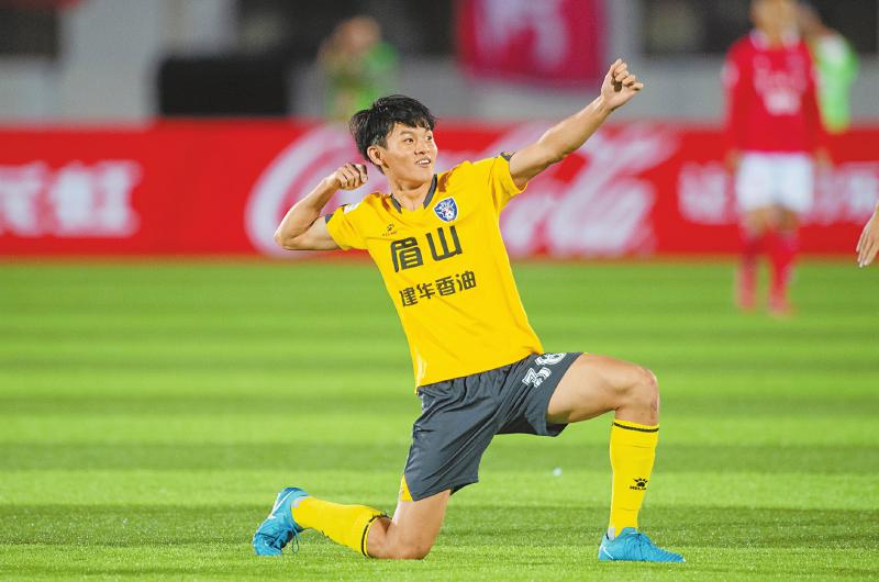 10月19日,眉山射天狼队以1∶0战胜攀枝花攀钢钢铁勇士队。36号球员卢梓瀚进球后,兴奋地向看台比出“射天狼”专属手势。