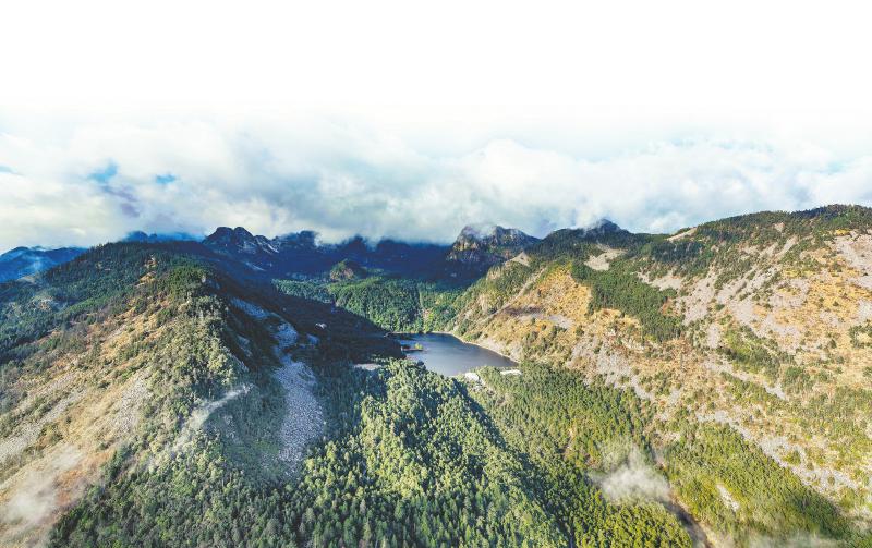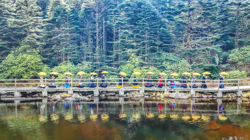 在海拔3600多米的黑龙潭,蓝天、白云与岸边的松柏倒映在如镜的湖面上,湖水像一块被群山捧着的蓝宝石,澄澈得能看见湖底。这里的天气变幻莫测,时而晴空万里,时而云雾缭绕。阳光普照时,游客们撑着伞在湖边行走,宛如流动的画卷;薄雾弥漫时,山川、树木、溪流、步道若隐若现,笼罩在一层层轻柔的白纱之中。