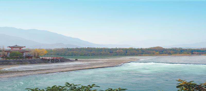 从都江堰怀古亭凭栏远眺,不仅能看到浩浩荡荡的岷江奔腾而来,还能近距离地观赏飞沙堰、宝瓶口的壮丽景色,将远处群峰和古堰美景尽收眼底。