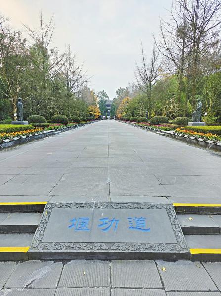 行走在都江堰宽阔的堰功道,中国历史上十二位治水先贤的塑像位列两侧,绿树红花相伴左右。