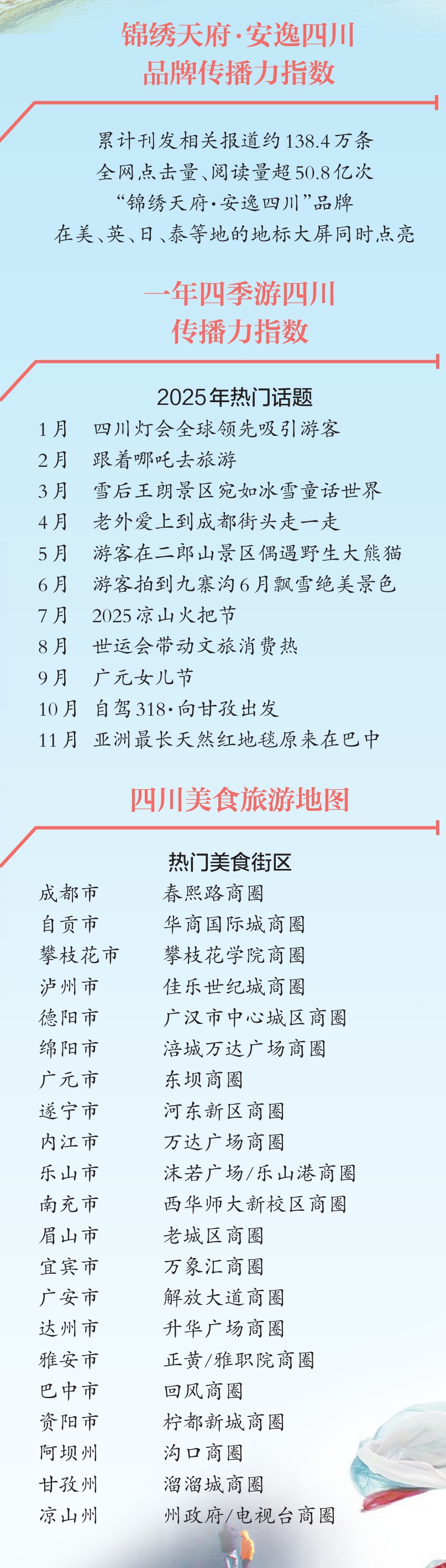 本报讯(四川日报全媒体记者 张斌吴梦琳)12月8日,在2025四川省冬季旅游季启动仪式上,四川大学教授、博士生导师、世界研学旅游组织执行主席杨振之代表四川文化旅游宣传推广联盟,正式发布“锦绣天府·安逸四川”系列文旅指数,通过大数据深度解读四川文旅品牌发展、季节旅游热度与美食旅游消费的新趋势。这也是四川首次发布系列文旅指数。