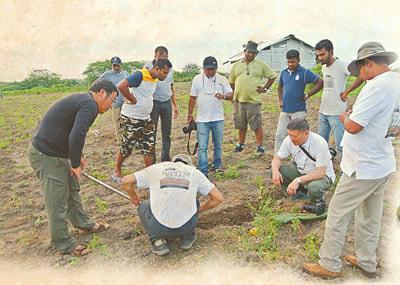 每隔10米1个钻孔,在遗址内密集地布设开来。中国考古中常用的洛阳铲,在斯里兰卡遗址中得到令人惊喜的发挥。钻探结果显示,在探杆下到约1.2米处时,部分钻孔就已经带出具有断代意义的遗物。它们包括公元8世纪到10世纪的南亚黑红陶及公元9世纪到10世纪的中国青瓷片;并发现了时代不明的玻璃残片,疑似产自西亚地区。钻探间隙,联合考古队还围绕城垣展开踏查,确认了曼泰港城垣的分布情况。