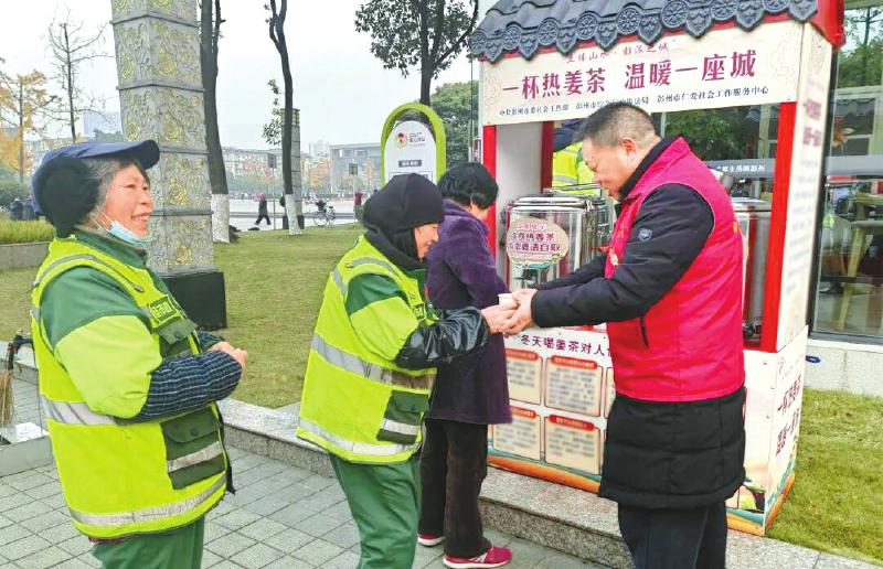 街头巷尾的暖心驿站是彭州志愿者为城市守护者搭建的“避风港”。每天清晨六点,天还未亮,彭州市仁爱社会工作服务中心的志愿者们就已开始熬制热腾腾的姜茶。“要不断搅拌,才能让姜味充分释放,喝着更暖身。”“冬送温暖”关爱行动发起人徐远隆一边搅动着锅里的姜茶,一边叮嘱身边的志愿者。