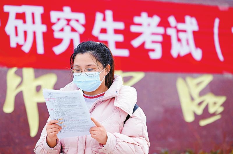 12月20日,在山东省枣庄市市中区实验中学考点,考生在等候进场时复习。当日,2026年全国硕士研究生招生考试初试开考。新华社发(孙中喆 摄)