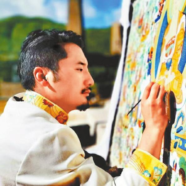 阿坝州青俊人才、高级唐卡画师三郎罗尔伍在作画(资料图片)。马尔康市委宣传部供图