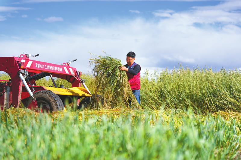 红原县益众农技服务专业合作社带头人旦真贡在收割牧草(资料图片)。红原县委宣传部供图
