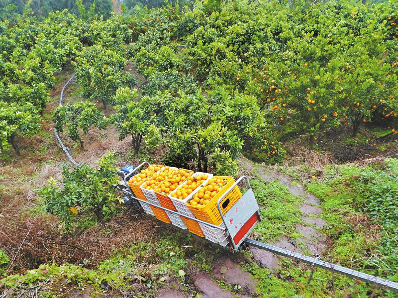 “智能小火车”运载新鲜采摘的柑橘行驶在轨道上。