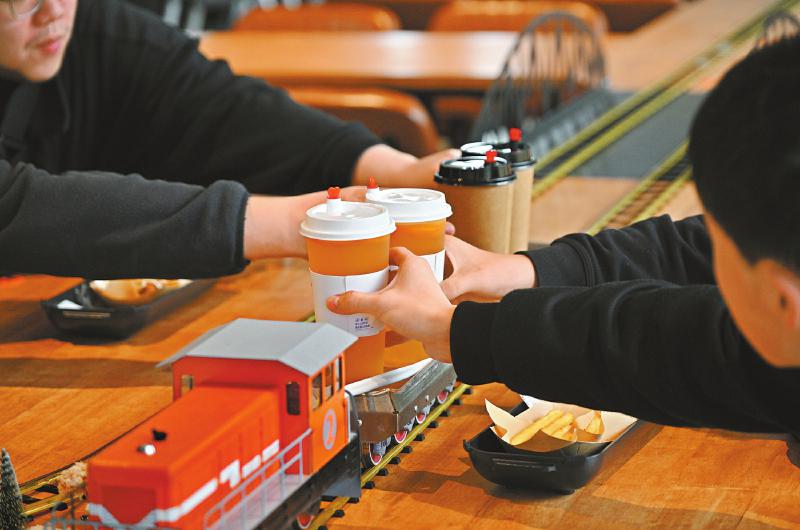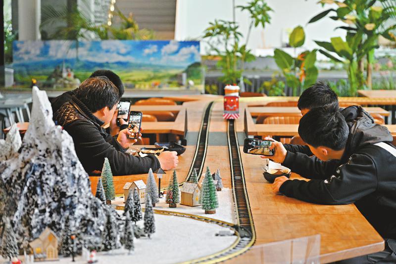 12月24日,成都机车厂老厂房改造的火车主题餐厅吸引不少市民前来打卡,顾客从送餐“小火车”上取餐。