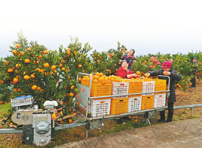 12月23日,在达州市达川区管村镇杨岩村柑橘种植园里,果农将新鲜采摘的柑橘装上无人驾驶“智能小火车”。