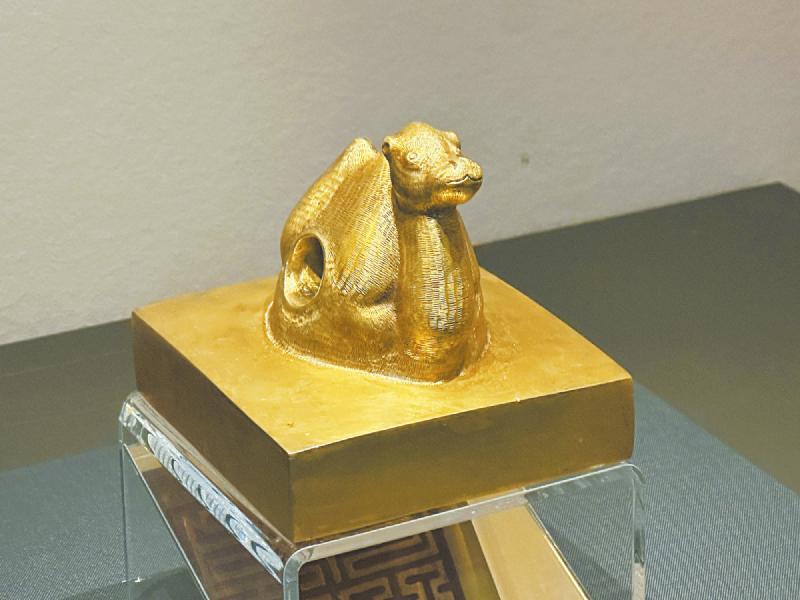 此次展览,展出了墓葬出土的20多件精美文物,既有用于装饰的各种金链、金牌、绿松石、玛瑙,也有木勺、织锦等实用物,尤其值得关注的是一枚“外甥阿柴王之印”。这枚印章印面主体部分为骆驼图案,边缘部分为古藏文“外甥阿柴王之印”。“‘阿柴’是吐蕃对吐谷浑的称谓。”卢玥颖介绍,“历史上,吐谷浑王室曾与吐蕃王室联姻,形成了特殊的甥舅关系。”