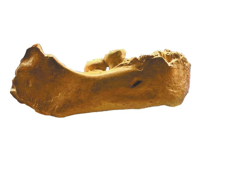 展出的这件丹尼索瓦人下颌骨化石(复制品),由甘肃夏河县当地人1980年在白石崖溶洞中发现,因此又被称为“夏河人”下颌骨。它形态原始,保存着两颗完整的臼齿。多年来,中国科学院院士陈发虎率研究人员对化石展开全面分析,最终鉴定化石形成于距今至少16万年前,将青藏高原最早的人类活动记录从距今约4万年提早到距今至少16万年。