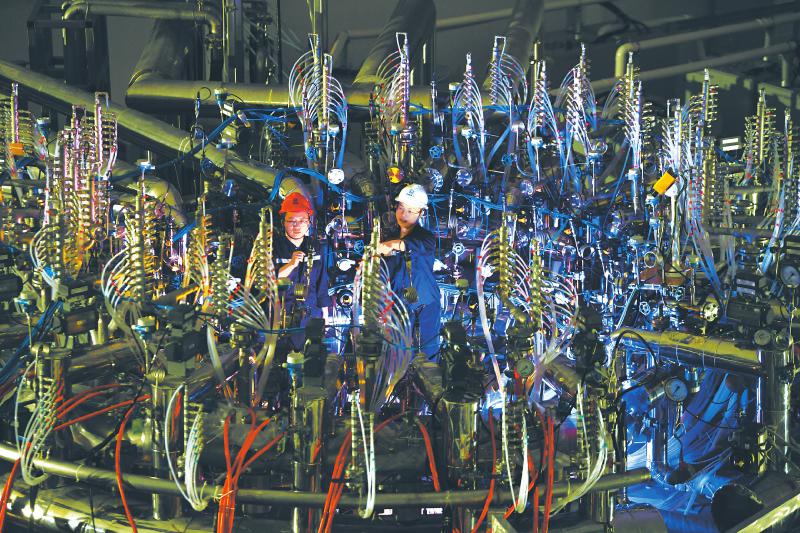 深邃蓝 人造太阳 2025年,我国自主研发的新一代人造太阳“中国环流三号”连续取得重大进展:实现等离子体电流100万安培、离子温度1亿摄氏度、高约束模式运行,创下我国聚变装置运行新纪录。图为6月7日,科技人员在装置顶部检查调试。