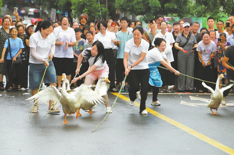 烟火橙 乡间竞技 7月11日,宜宾市长宁县铜锣镇推出了一场集采摘、民俗与美食体验于一体的农文旅活动。现场游客积极参与赶鹅等趣味游戏,感受乡村生活的生动气息。