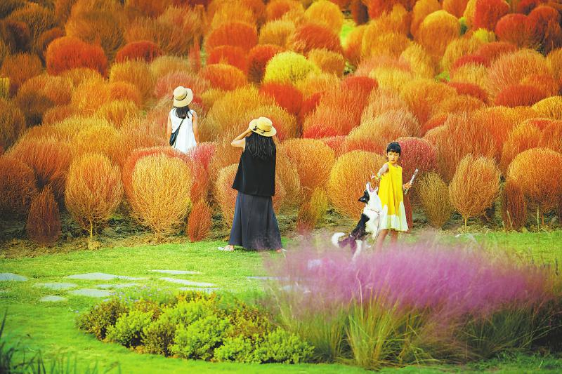秋日花田 10月3日,成都双流空港花田的粉黛乱子草与地肤草正值最佳观赏期,绯红与橙红交织的秋色吸引众多市民前来赏景游玩,乐享秋日时光。