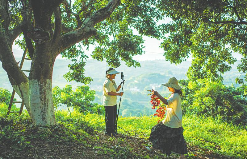 蓬勃绿 荔枝出圈 2025年夏,电影《长安的荔枝》热播,合江荔枝顺势“出圈”。泸州市合江县荔江镇荔枝古树公园是全省首批古树公园之一,丰收季,有着370年树龄的“妃子笑”枝头缀满果实。图为7月16日清晨,新农人姜晓霞(右)带着团队在荔枝古树公园内直播带货。