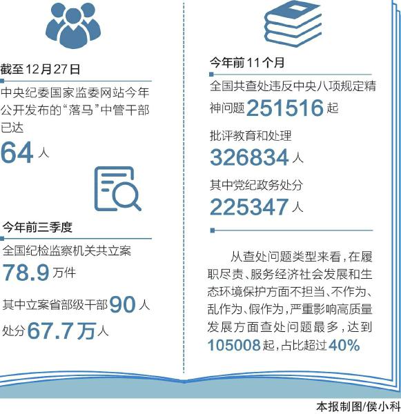 今年前三季度,立案78.9万件,其中立案省部级干部90人;今年前11个月,全国查处违反中央八项规定精神问题超25万起,批评教育和处理超32万人;二十届中央第五、六轮巡视完成对省区市巡视全覆盖……