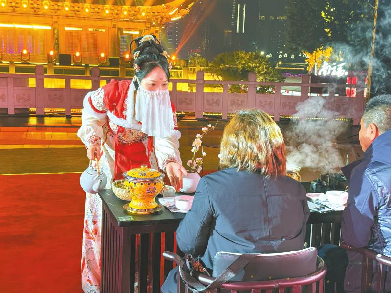 创造力转化为实实在在的吸引力。向柯宇表示,配合消费券等促消费措施,活动高峰期“长江酒席”单日人流量破万,音乐酒会与宫廷酒宴区域常一位难求,“暖经济”在寒夜里持续升温。
