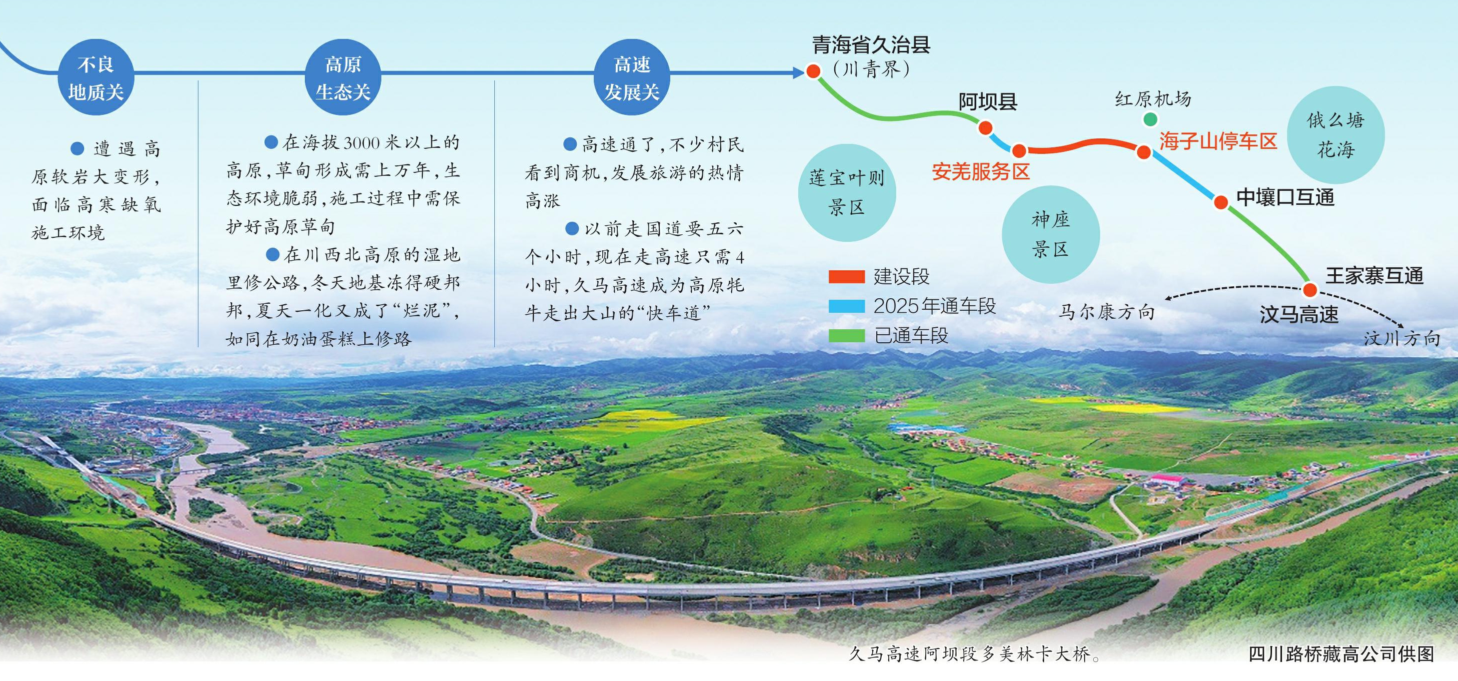 2025年12月29日24时,青海久治至四川马尔康高速公路(简称久马高速)再通87.5公里,结束阿坝州红原县不通高速的历史,从成都驾车前往红原大草原的时间缩短至4小时。