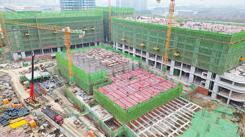 记者在现场看到,占地55亩的工地上,5栋大楼正拔地而起。4台塔吊在空中舒展钢铁臂膀,地面不时传来调度指令。