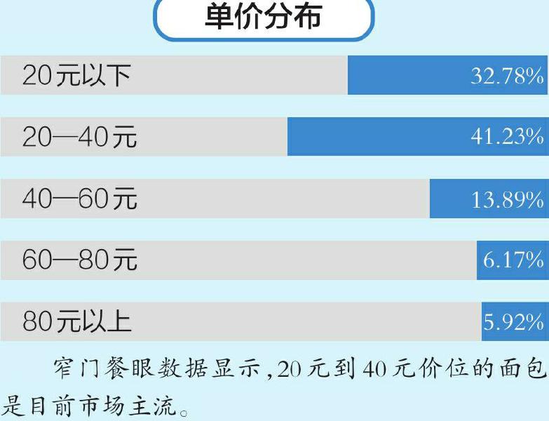放眼全国范围,面包价格的变化更加直观。2018年至2024年,“企鹅吃喝指南”微信公众号发布的面包榜单中,最低价从8元涨至12元;较贵的面包单品价格分布在30元到68元之间。而窄门餐眼的统计则能看到更加细分的价格数据:20元以下的面包占32.78%,20元至40元的面包占41.23%,40元至60元的面包占13.89%。从数据可以看出,20元至40元价位的面包是目前市场的主流。