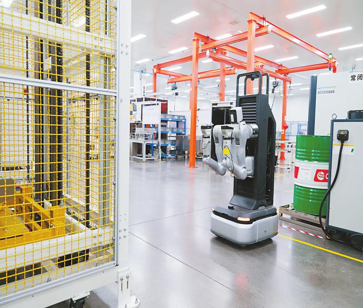 身高约1.7米的轮式机器人穿梭在富临精工的流水线间。 四川日报全媒体记者 郝飞 摄